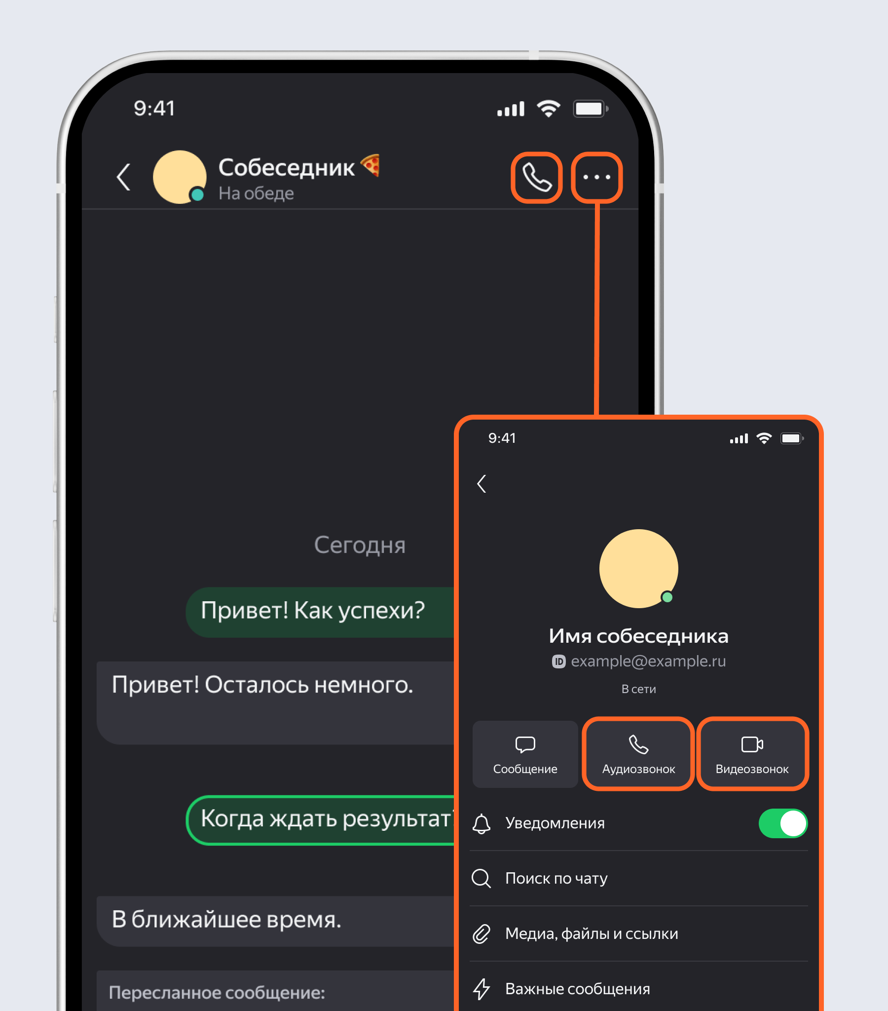 Если нужно обсудить вопрос голосом, вы можете позвонить собеседнику прямо в Телемосте — с видео или без.