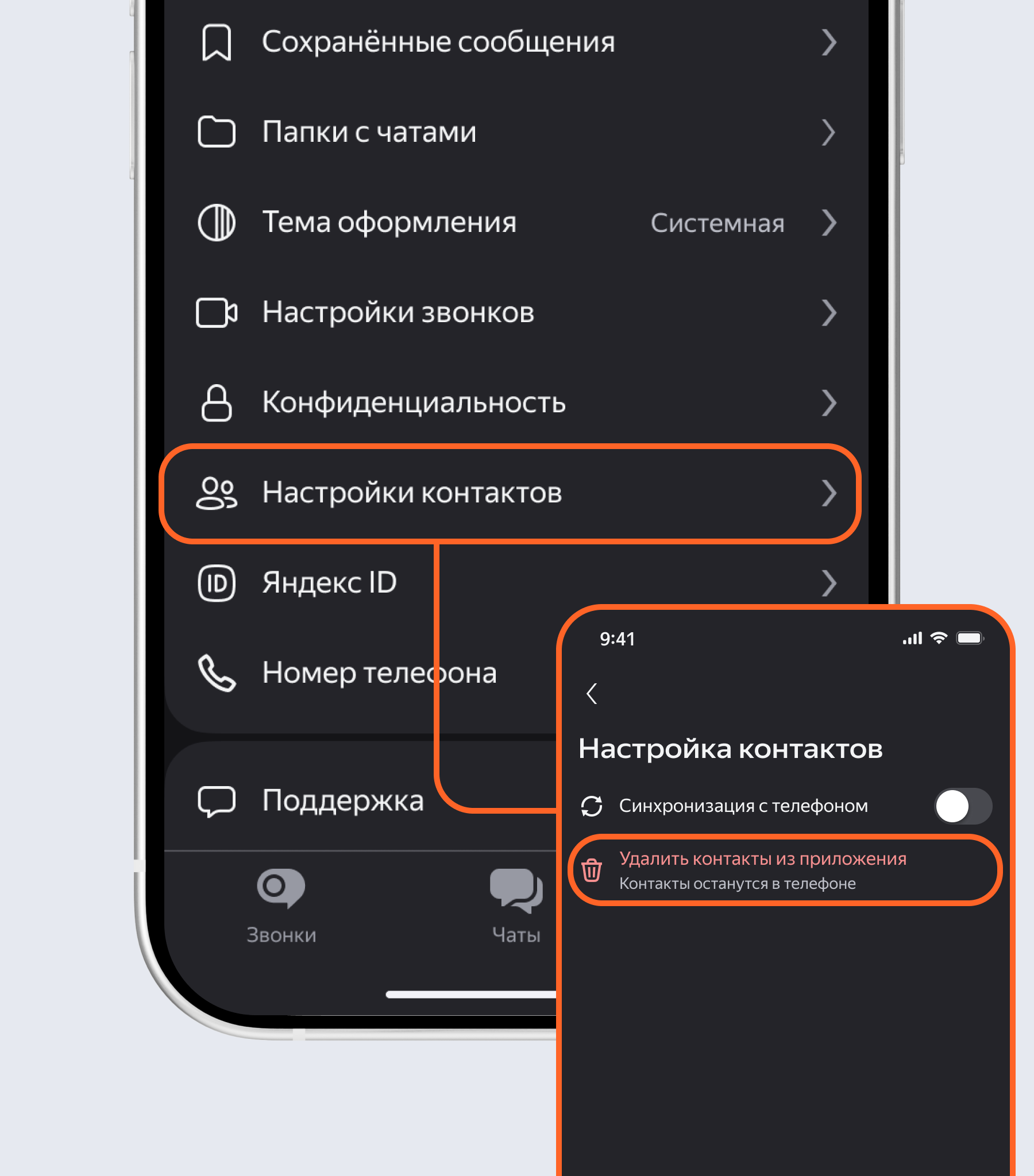 Для начала общения в Телемосте синхронизируйте с приложением список контактов в телефоне — так вы сможете найти и связаться в Телемосте с любым человеком из него. Если добавите или удалите контакт в телефоне, изменения отобразятся и в приложении.