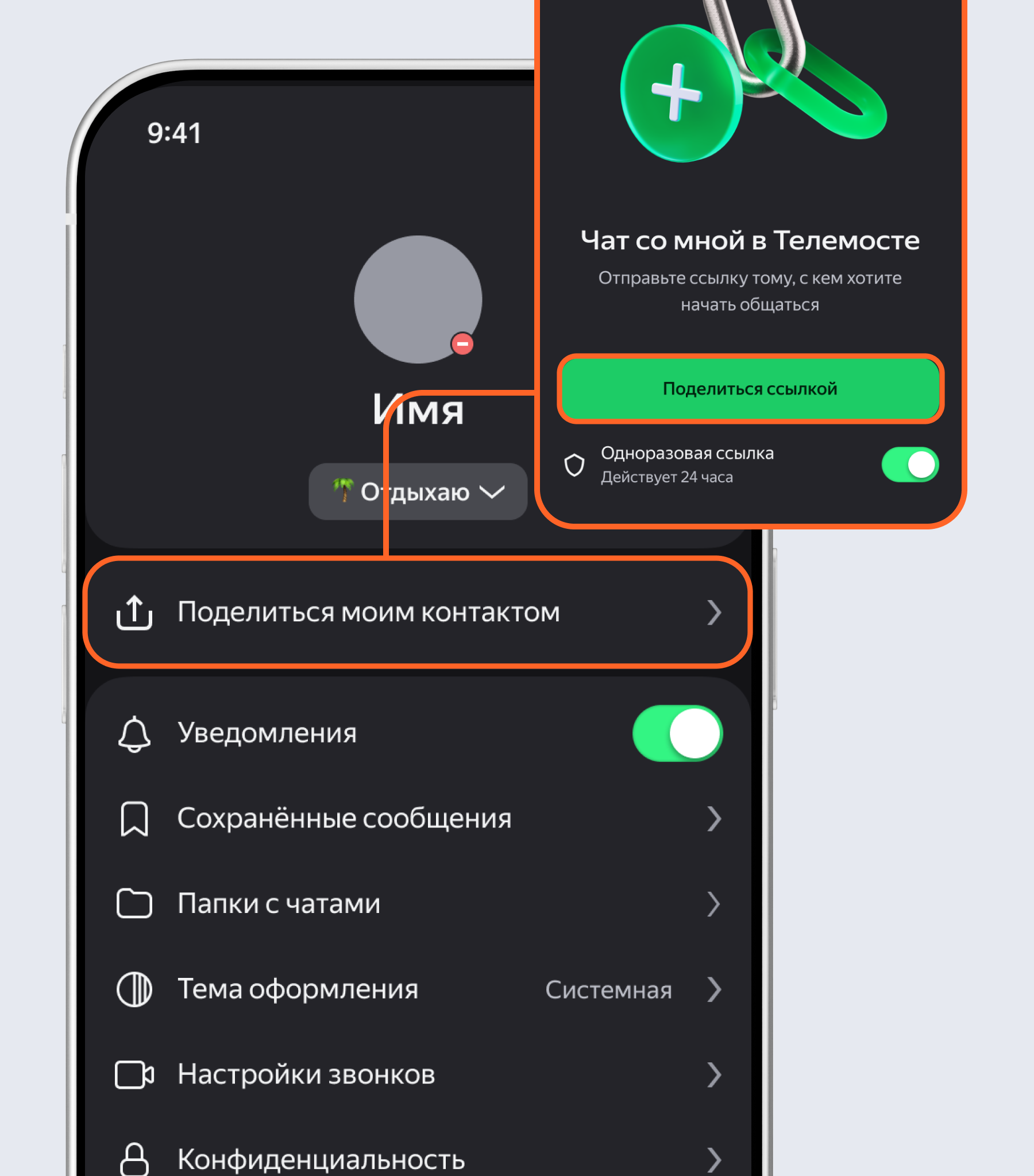 По умолчанию ссылка будет одноразововой. С ее помощью с вами может связаться только один человек. Если в течение 24 часов с момента создания с вами не свяжутся, она перестанет действовать. Чтобы пригласить по одной ссылке больше людей и сделать ее бессрочной, отключите опцию Одноразовая ссылка. Так перейти по ней и написать вам сможет любой, кто ее получит, — делитесь ссылкой с осторожностью.
