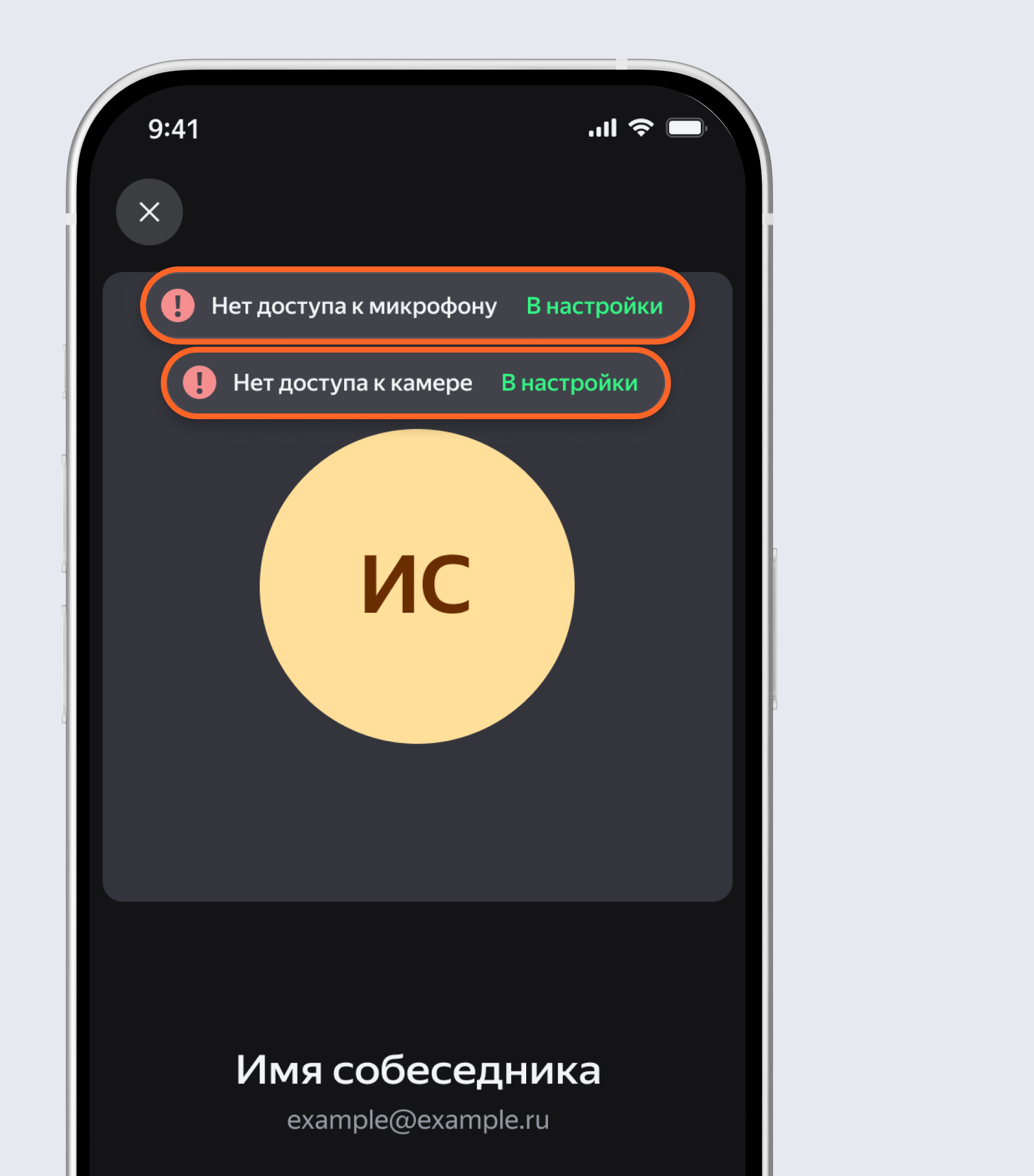 Telemostda birinchi marta chaqiruv qilganingizda yoki kiruvchi chaqiruvga javob berganingizda, ilova mikrofonga va kameraga (agar bu video chaqiruv bo‘lsa) kirishni so‘raydi. Ruxsatni darhol yoki keyinroq oddiy usulda berishingiz mumkin. Ushbu ruxsatlarsiz Telemost orqali chaqiruv qilib bo‘lmaydi.