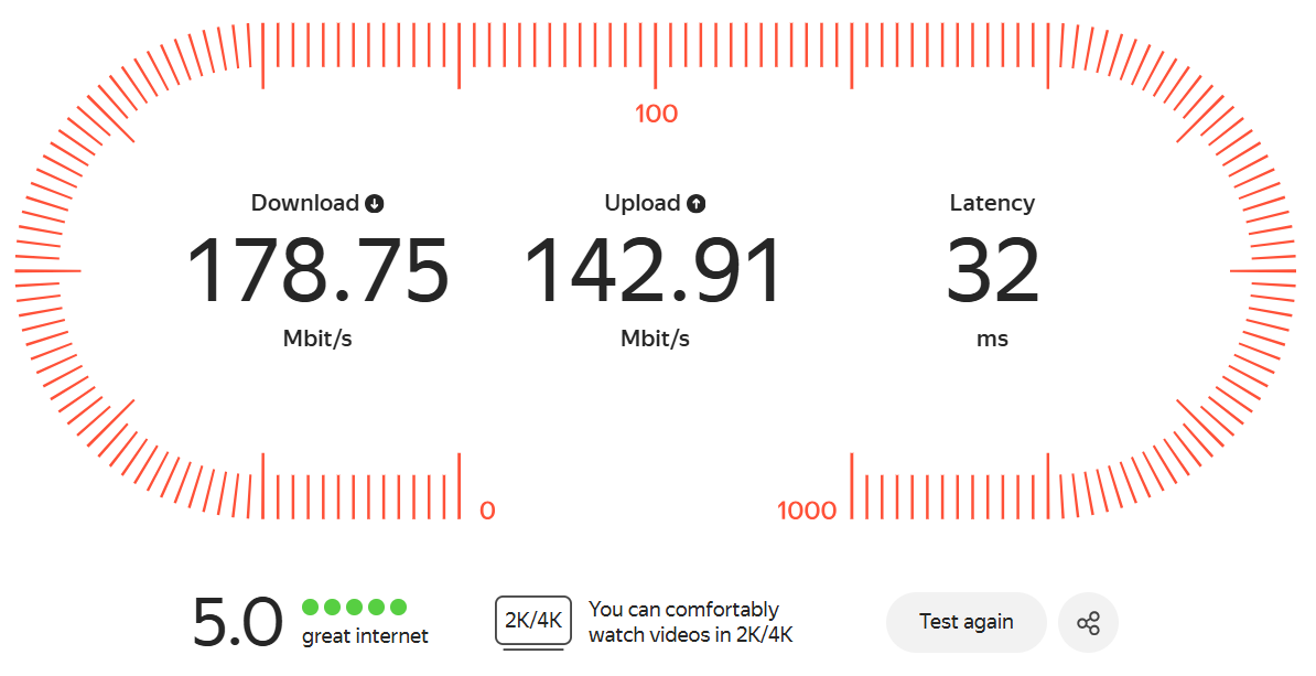 Yandex Internetometer tests your connection speed using Yandex CDN servers. The service simultaneously pings several nearby servers to accurately measure the speed on your specific network segment, whether it's your local ISP or mobile carrier.
